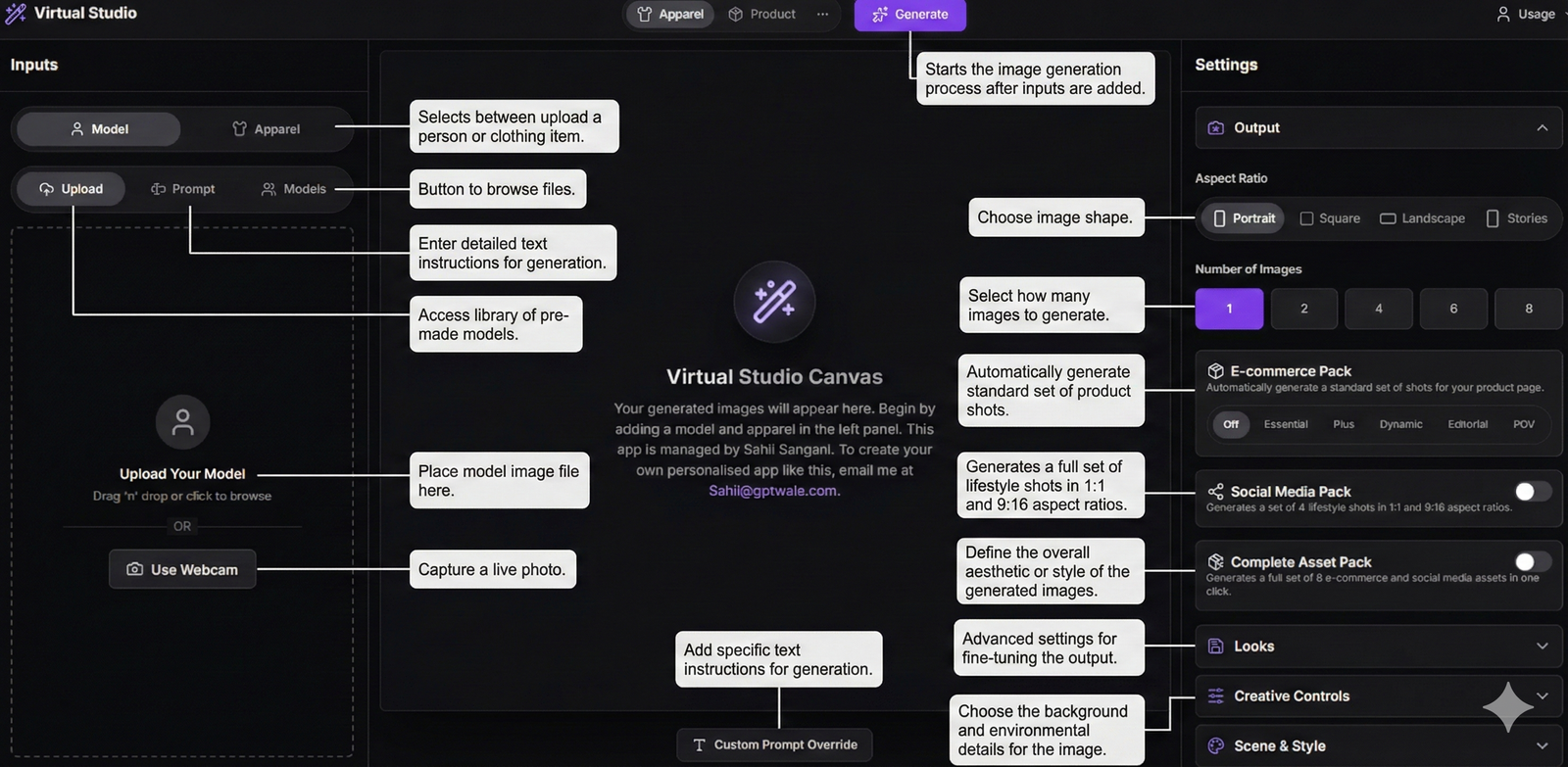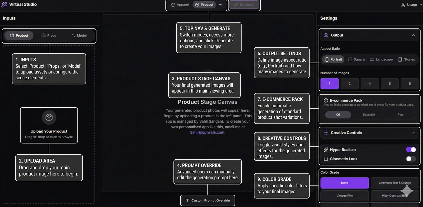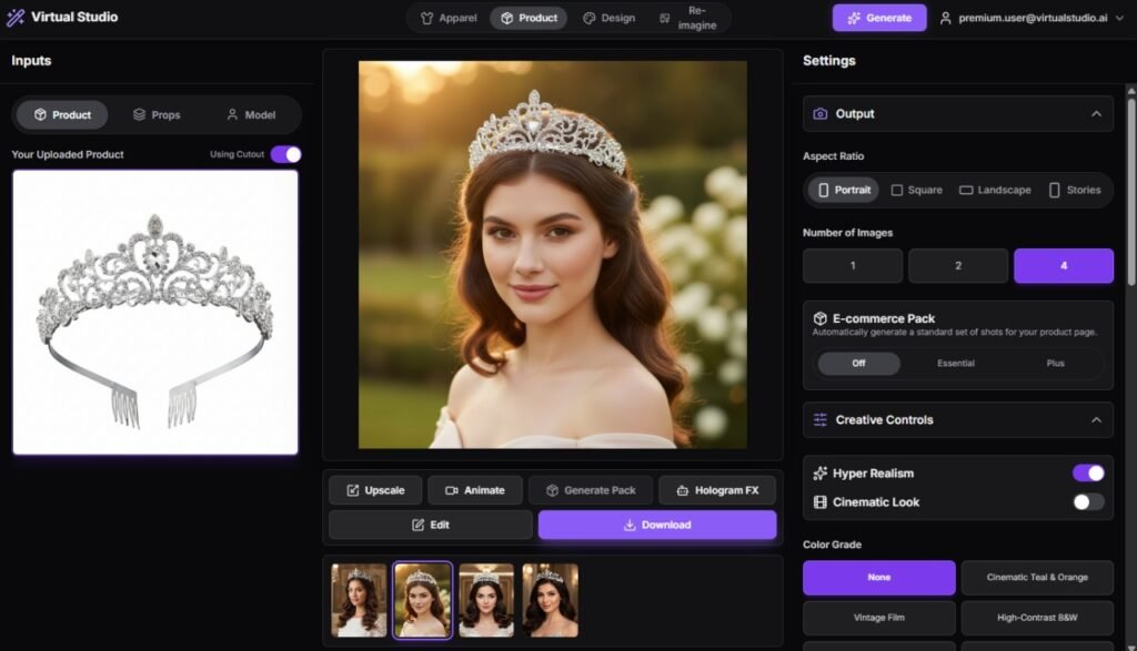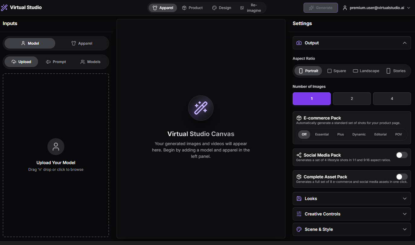Virtual Studio AI is your personal AI-powered photography and design studio. It lets you upload any product or apparel image and instantly generate high-quality photos, lifestyle visuals, and even short animation clips — all without hiring photographers, models, or editors.