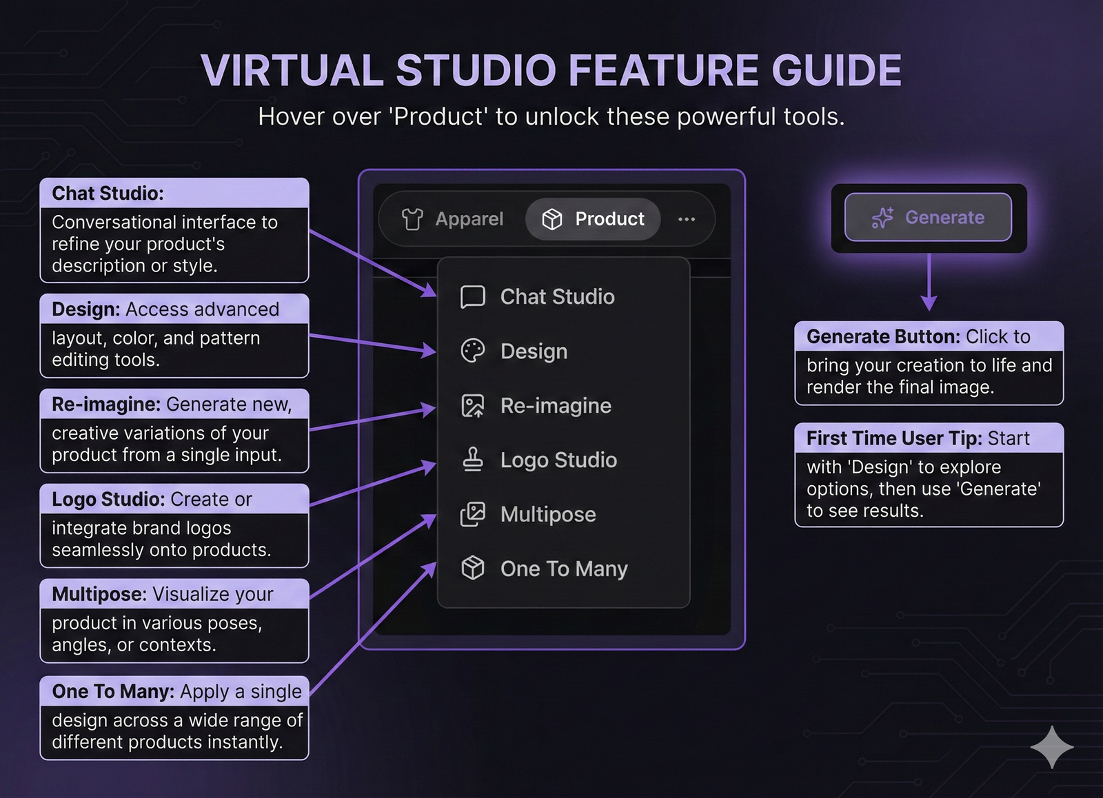 With Virtual Studio AI, you can create professional apparel, jewelry, or product visuals in seconds, not weeks. no camera, model, or editor needed.