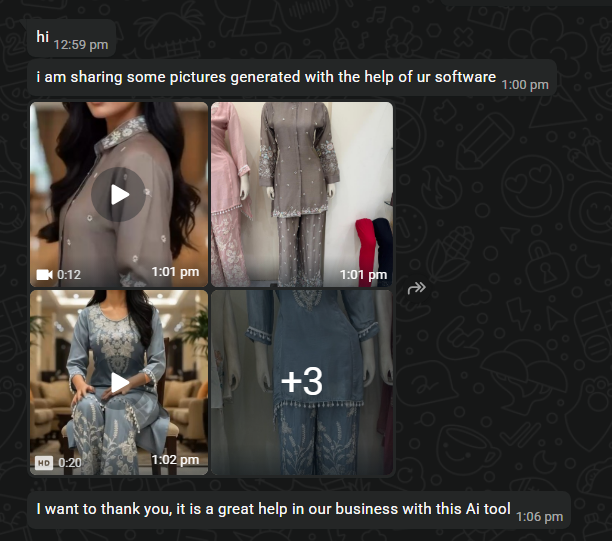 Yes. You can animate your generated images with simple AI effects like catwalk loops, product rotations, or cinematic pans. Full-length video generation is in progress but not sure if it will be added or not.